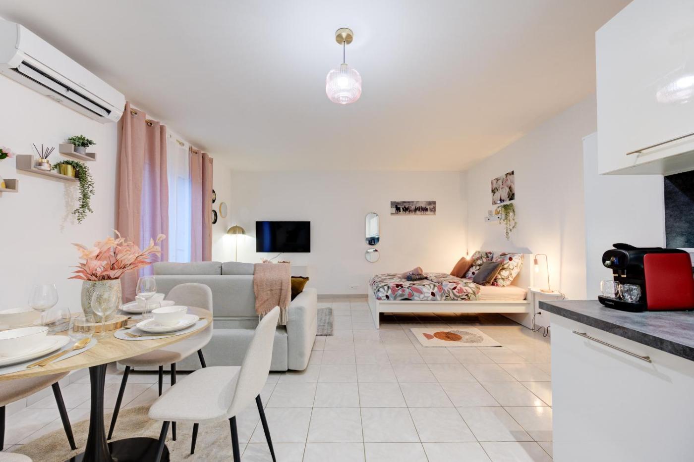 Cet appartement avec climatisation se compose de 1 chambre, dun salon, dune kitchenette entièrement équipée avec un réfrigérateur et une machine à café, ainsi que de 1 salle de bains avec une douche et des articles de toilette gratuits. Des serviettes et du linge de lit sont à disposition.