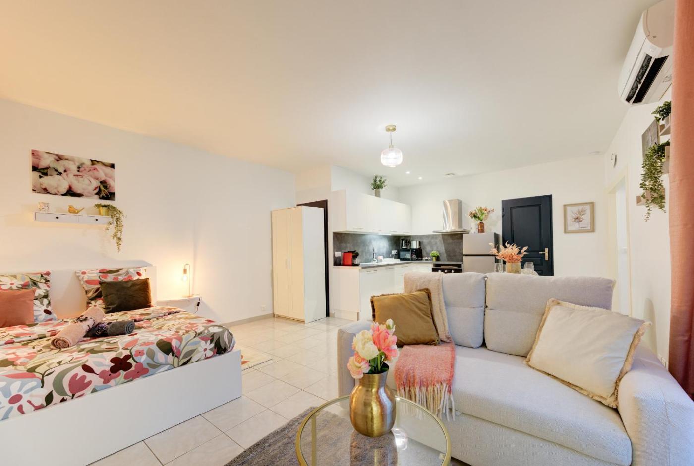 Appartement 1 Chambre. Boasting a private entrance, this air-conditioned apartment comes with 1 living room, 1 separate bedroom and 1 bathroom with a walk-in shower and a hairdryer. Guests can make meals in the kitchenette that features a stovetop, a refrigerator, kitchenware and an oven. Featuring a terrace with garden views, this apartment also features a washing machine and a flat-screen TV with cable channels. The unit has 2 beds.