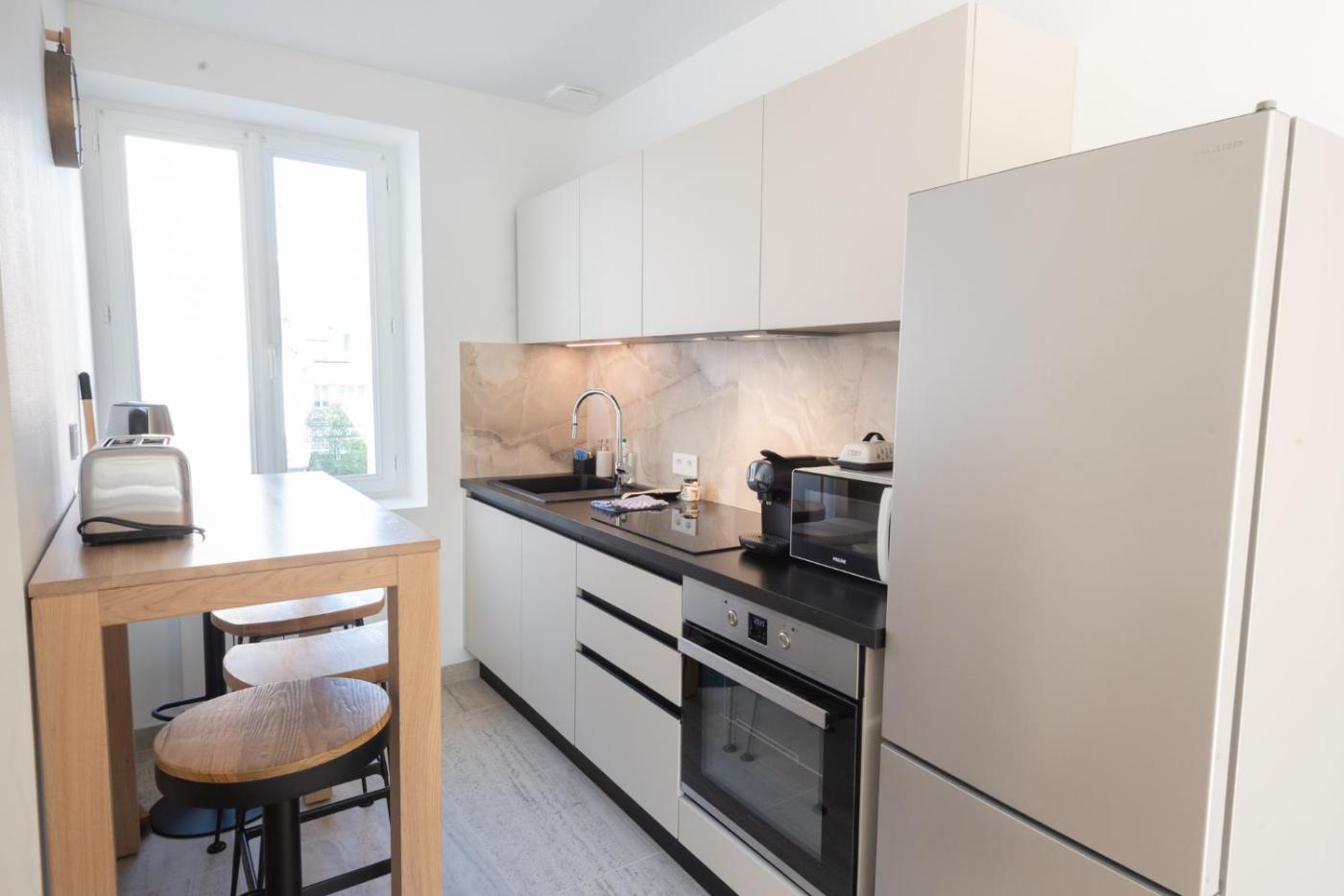 Appartement 1 Chambre. Boasting a private entrance, this apartment includes 1 living room, 1 separate bedroom and 1 bathroom with a walk-in shower and a hairdryer. Guests can make meals in the kitchen that is fitted with a stovetop, a refrigerator, a dishwasher and kitchenware. The apartment offers a flat-screen TV with cable channels, a washing machine, a tea and coffee maker, a seating area as well as city views. The unit has 2 beds.