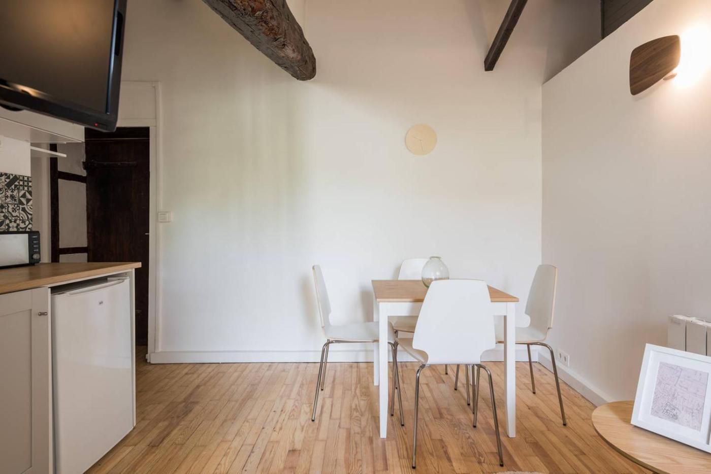 Appartement 1 Chambre. Featuring a private entrance, this apartment comprises 1 living room, 1 separate bedroom and 1 bathroom with a shower and a hairdryer. Guests can make meals in the kitchen that comes with a stovetop, a refrigerator, kitchenware and an oven. The apartment features parquet floors, a seating area with a flat-screen TV, a coffee machine, a dining area as well as garden views. The unit offers 2 beds. ;