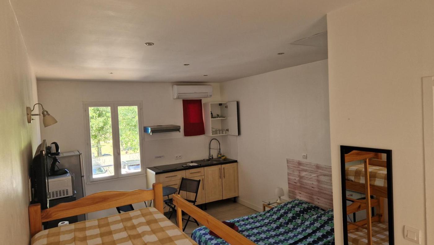 Studio. La cuisine bien équipée est munie de plaques de cuisson, d’un micro-ondes, d’un réfrigérateur et d’ustensiles. Doté dune terrasse donnant sur la cour intérieure, ce studio dispose de la climatisation et dune entrée privée. La salle de bains privative est pourvue d’une douche. Ce logement comporte 3 lits. ;