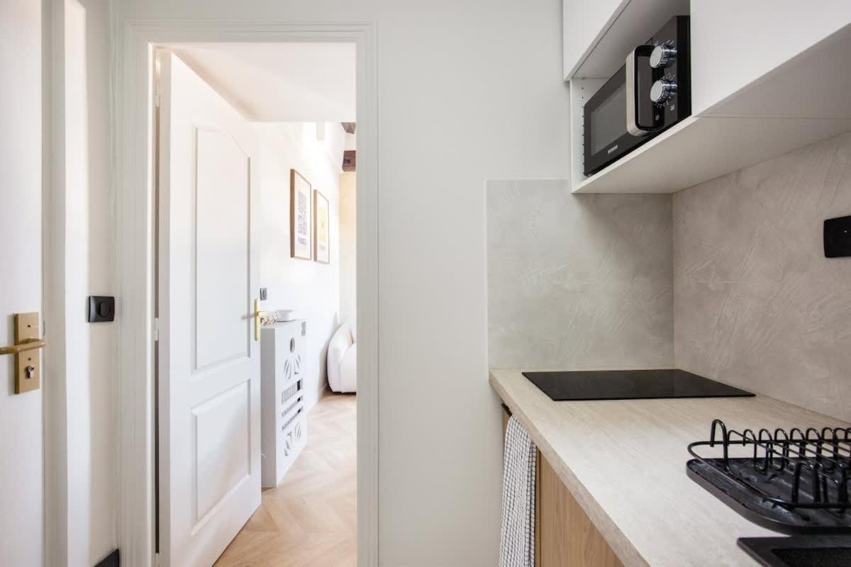 Studio. The kitchen features a refrigerator, kitchenware and a microwave. The studio features a washing machine, a tea and coffee maker, a wardrobe, heating and a TV with streaming services.