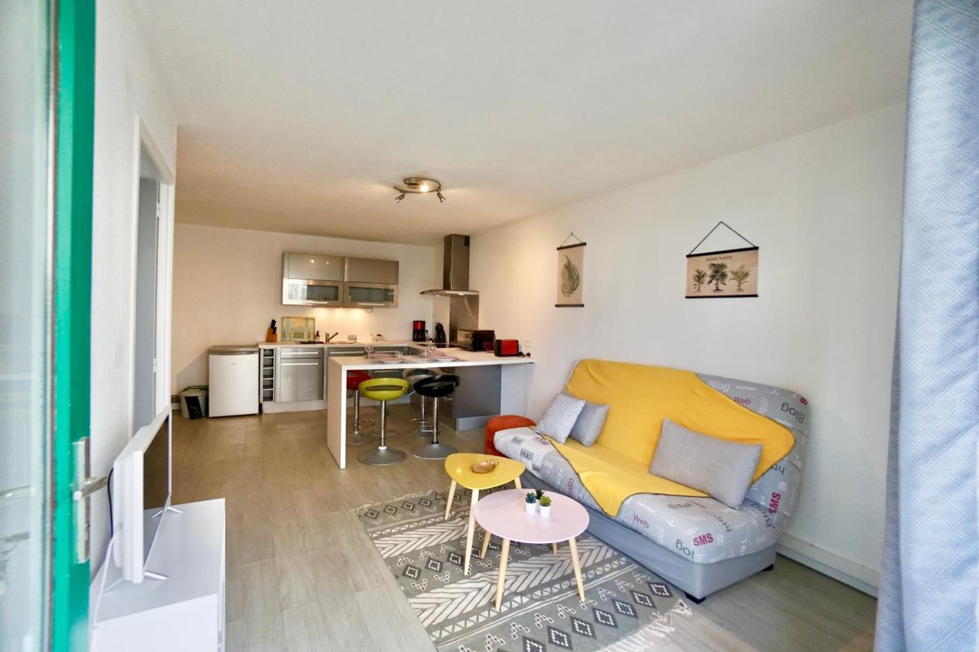 Appartement 1 Chambre - Côté Mer. The apartment has 1 bedroom, 1 bathroom and a kitchen. The apartments kitchen is available for cooking and storing food. Boasting a terrace, this apartment also features an electric kettle, heating and a flat-screen TV. The unit has 2 beds.