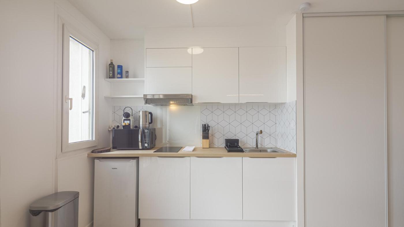 La cuisine est pourvue d’un réfrigérateur, d’un micro-ondes et d’une plaque de cuisson. Elle est également dotée d’une machine à café et d’une bouilloire.