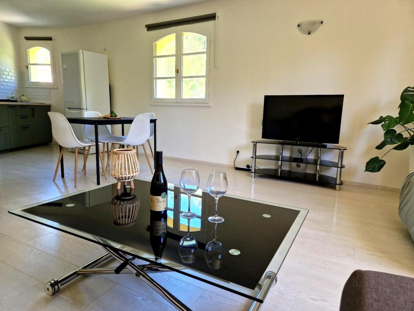Maison 1 Chambre. Guests will have a special experience as this holiday home offers a hot tub and a spa bath. Boasting a private entrance, this holiday home features 1 living room, 1 separate bedroom and 1 bathroom with a shower and a hairdryer. Guests will find a stovetop, a refrigerator, a dishwasher and kitchenware in the well-equipped kitchen. The holiday home also comes with a barbecue. Featuring a terrace with garden views, this holiday home also features a washing machine and a flat-screen TV with streaming services. The unit has 2 beds.