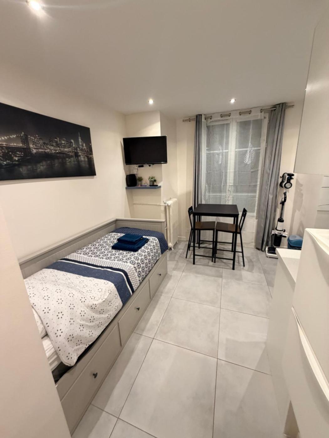 Appartement 1 Chambre. The well-fitted kitchenette features a stovetop, a refrigerator, kitchenware and an oven. The apartment offers a flat-screen TV with satellite channels, a washing machine, a private entrance, a tea and coffee maker as well as city views. The unit offers 2 beds.